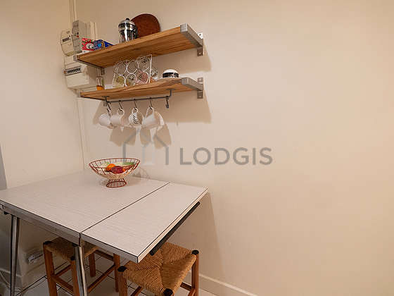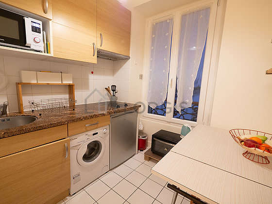 Este apartamento tem uma bonita cozinha com azuleijo no piso e todo o equipamento pela sua vida quotidiana : fogaõ, frigorífico, microondas, exaustur, torradeira, chaleira, máquina de café, mesa de jantar, armário, loiça, banco.