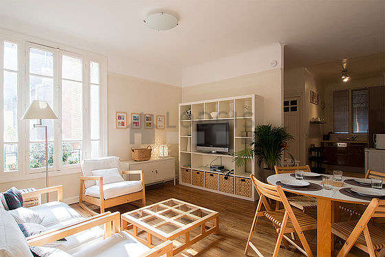 Este apartamento é composto de um agradável salão com parqué no piso é janelas é vista sobre pátio. Este salão calmo mobiliado et equipado para uma agradável estância : televisaõ, sofá, 2 poltrona(s), mesa de jantar, mesinha, biblioteca, prateleira, 4 cadeira(s).