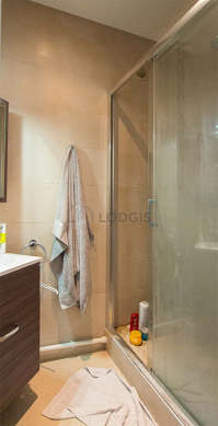 Este apartamento é equipado de uma casa de banho agradável. Esta sala de água dispõe do necessário pelo seu bem estar na sua vida quotidiana : toalhas de banho, armário, ducheiro separado, radiator secador de toalhas. Os WC são separados da casa de banho e situados em uma peça independente.