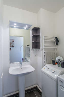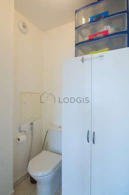 Este apartamento é equipado de uma casa de banho agradável é clara. Esta sala de água dispõe do necessário pelo seu bem estar na sua vida quotidiana : toalhas de banho, prateleira, ducheiro separado, radiator secador de toalhas. Os WC são separados da casa de banho e situados em uma peça independente.