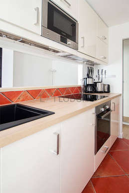 Este apartamento tem uma bonita cozinha com azuleijo no piso e todo o equipamento pela sua vida quotidiana : fogaõ, frigorífico, congelador, forno, microondas, exaustur, torradeira, chaleira, máquina de café, prateleira, armário, loiça.