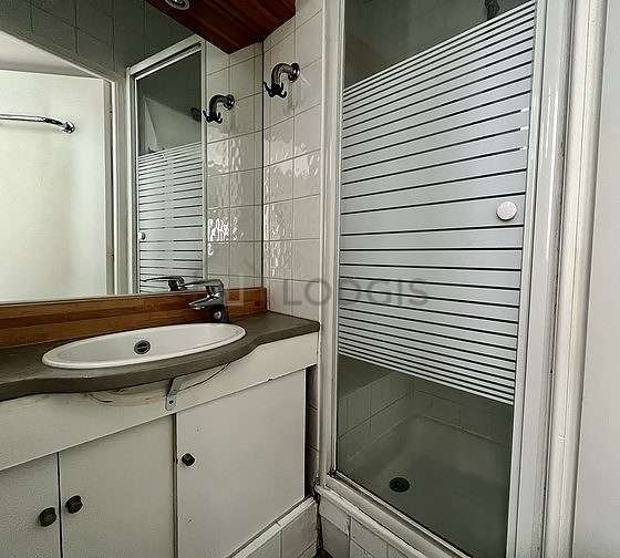 Este apartamento é equipado de uma casa de banho agradável é muito clara with janelas. Esta sala de água dispõe do necessário pelo seu bem estar na sua vida quotidiana : toalhas de banho, prateleira, armário, ducheiro separado, radiator secador de toalhas. Os WC são integrados na casa de banho.