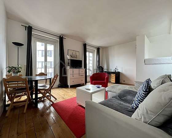 Este apartamento é composto de um charmoso salão com parqué no piso é janelas vitros duplos é vista sobre rua. Este salão very quiet mobiliado et equipado para uma agradável estância : televisaõ, colchas, sofá, 1 poltrona(s), mesa de jantar, mesinha, secretária, roupeiro, prateleira, armário, 4 cadeira(s).