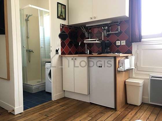 Este apartamento tem uma magnífico cozinha com parqué no piso e todo o equipamento pela sua vida quotidiana : fogaõ, frigorífico, microondas, freezer, torradeira, chaleira, máquina de café, prateleira, armário, loiça.