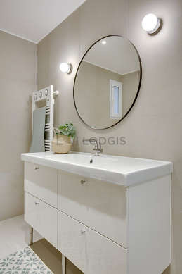 Este apartamento é equipado de uma casa de banho agradável. Esta sala de água dispõe do necessário pelo seu bem estar na sua vida quotidiana : toalhas de banho, armário, secador, radiator secador de toalhas. Os WC são integrados na casa de banho.