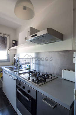Este apartamento tem uma bonita cozinha com azuleijo no piso e todo o equipamento pela sua vida quotidiana : fogaõ, frigorífico, congelador, forno, microondas, exaustur, torradeira, máquina de café, armário, loiça.