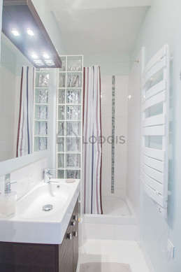 Este apartamento é equipado de uma casa de banho magnífico. Esta sala de água dispõe do necessário pelo seu bem estar na sua vida quotidiana : toalhas de banho, armário, ducheiro separado, radiator secador de toalhas. Os WC são separados da casa de banho e situados em uma peça independente.
