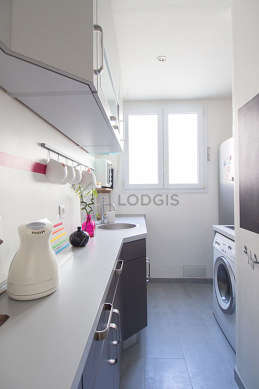 Este apartamento tem uma magnífico cozinha com azuleijo no piso e todo o equipamento pela sua vida quotidiana : fogaõ, frigorífico, congelador, forno, exaustur, chaleira, máquina de café, armário, loiça.