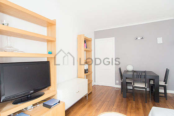 SalaõEste apartamento é composto de um bonito salão com parqué no piso é janelas vitros duplos é vista sobre rua. Este salão very quiet mobiliado et equipado para uma agradável estância : televisaõ, mesa de jantar, mesinha, secretária, biblioteca, prateleira, armário, 1 cadeira(s)1 sofá-cama.