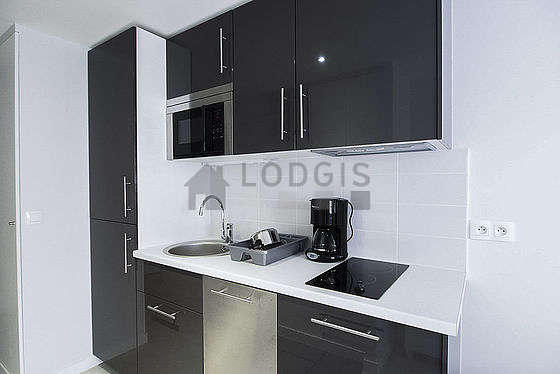 Este apartamento tem uma magnífico cozinha com parqué no piso e todo o equipamento pela sua vida quotidiana : fogaõ, frigorífico, microondas, freezer, exaustur, torradeira, chaleira, máquina de café, armário, loiça.