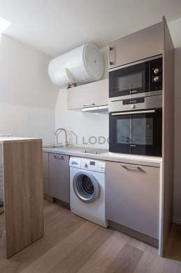 Este apartamento tem uma magnífico cozinha com parqué no piso e todo o equipamento pela sua vida quotidiana : fogaõ, frigorífico, forno, microondas, exaustur, chaleira, máquina de café, armário, loiça.