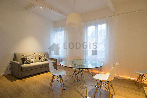 Este apartamento é composto de um charmoso salão com parqué no piso é janelas vitros duplos é vista sobre pátio. Este salão very quiet mobiliado et equipado para uma agradável estância : lençois, colchas, mesa de jantar, roupeiro, armário, viga, 4 cadeira(s)1 sofá-cama.