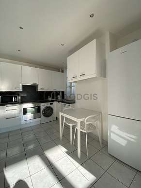 Este apartamento tem uma bonita cozinha com azuleijo no piso e todo o equipamento pela sua vida quotidiana : fogaõ, frigorífico, congelador, forno, microondas, exaustur, torradeira, chaleira, máquina de café, mesa de jantar, armário, loiça, 2 cadeira(s).