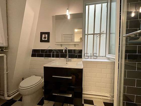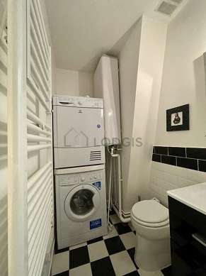Este apartamento é equipado de uma casa de banho agradável with janelas vitros duplos. Esta sala de água dispõe do necessário pelo seu bem estar na sua vida quotidiana : toalhas de banho, prateleira, ducheiro separado, secador, sanibroyer, sink, radiator secador de toalhas. Os WC são integrados na casa de banho.