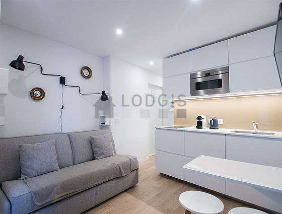 Este apartamento tem uma magnífico cozinha com parqué no piso e todo o equipamento pela sua vida quotidiana : fogaõ, frigorífico, microondas, freezer, chaleira, máquina de café, armário, loiça.