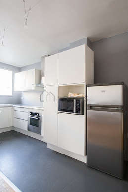 Este apartamento tem uma bonita cozinha com betão no piso e todo o equipamento pela sua vida quotidiana : fogaõ, frigorífico, congelador, forno, microondas, exaustur, chaleira, armário, loiça, banco.