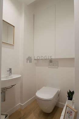 Este apartamento é equipado de uma casa de banho magnífico with janelas vitros duplos. Esta sala de água dispõe do necessário pelo seu bem estar na sua vida quotidiana : toalhas de banho, armário, banheira, secador, radiator secador de toalhas. Os WC são separados da casa de banho e situados em uma peça independente.