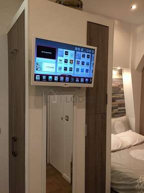 SalaõEste apartamento é composto de um bonito salão com parqué no piso é janelas vitros duplos é vista sobre rua. Este salão calmo mobiliado et equipado para uma agradável estância : televisaõ, lençois, colchas, mesinha, secretária, roupeiro, prateleira, armário, 2 cadeira(s), banco1 sofá-cama, 1 cama.