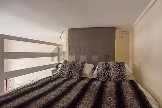 Graças a sua altura de teto, um bonita mezanino foi possível de ser instalado em este apartamento , oferecendo-lhe uma verdadeira peça suplementar equipada de televisaõ, lençois, colchas, tv stand.