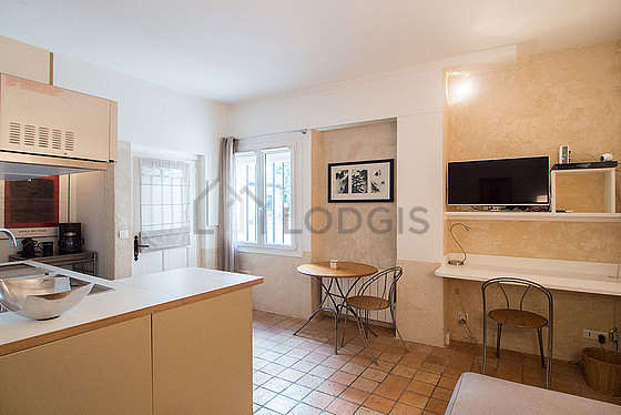 Este apartamento é composto de um atraente salão com piso de ceramica no piso é janelas vitros duplos é vista sobre pátio. Este salão calmo mobiliado et equipado para uma agradável estância : televisaõ, lençois, colchas, sofá, mesa de jantar, secretária, roupeiro, prateleira, armário, pedras aparentes, viga, 2 cadeira(s), curtains1 cama.
