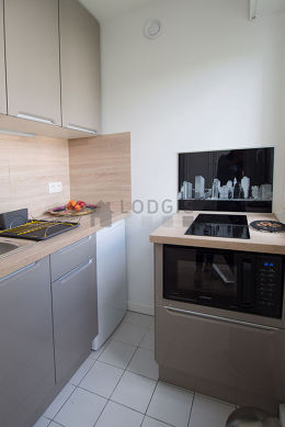 Este apartamento tem uma magnífico cozinha com azuleijo no piso e todo o equipamento pela sua vida quotidiana : fogaõ, frigorífico, micro-ondas combinado, freezer, torradeira, chaleira, máquina de café, prateleira, armário, loiça.