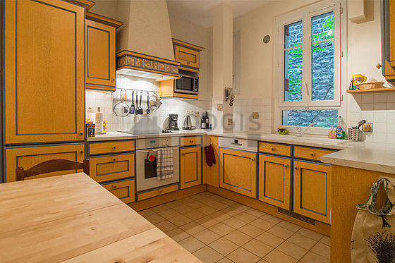 Este apartamento tem uma bonita cozinha com azuleijo no piso e todo o equipamento pela sua vida quotidiana : fogaõ, frigorífico, congelador, forno, microondas, exaustur, chaleira, máquina de café, mesa de jantar, armário, loiça, 1 cadeira(s).