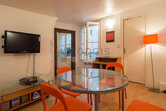 Este apartamento é composto de um salão com parqué no piso é janelas é vista sobre pátio. Este salão mobiliado et equipado para uma agradável estância : televisaõ, sofá, mesa de jantar, mesinha, secretária, 1 cadeira(s), floor lamp, painting.