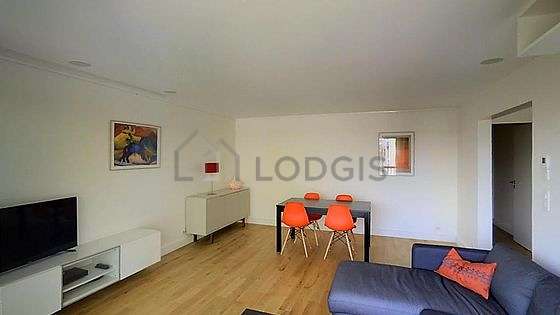 Este apartamento é composto de um soberbo salão com parqué no piso é janelas vitros duplos com balcão é vista sobre jardim. Este salão very quiet mobiliado et equipado para uma agradável estância : televisaõ, sofá, mesa de jantar, mesinha, bufet, 4 cadeira(s), floor lamp, lamp, tv stand, curtains, ceiling light, painting, vase.