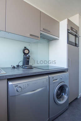 Este apartamento tem uma bonita cozinha com linoleo no piso e todo o equipamento pela sua vida quotidiana : fogaõ, frigorífico, congelador, forno, micro-ondas combinado, exaustur, chaleira, máquina de café, armário, loiça.