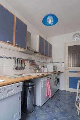 Este apartamento tem uma bonita cozinha com azuleijo no piso e todo o equipamento pela sua vida quotidiana : fogaõ, frigorífico, congelador, micro-ondas combinado, freezer, exaustur, torradeira, chaleira, máquina de café, mesa de jantar, armário, loiça, banco.