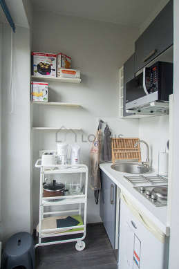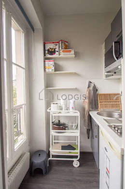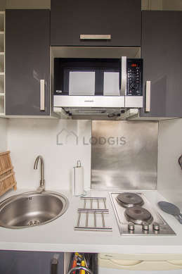 Este apartamento tem uma magnífico cozinha com parqué no piso e todo o equipamento pela sua vida quotidiana : fogaõ, frigorífico, micro-ondas combinado, freezer, torradeira, chaleira, máquina de café, prateleira, armário, loiça.