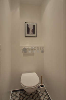 Este apartamento é equipado de uma casa de banho agradável é clara. Esta sala de água dispõe do necessário pelo seu bem estar na sua vida quotidiana : toalhas de banho, prateleira, ducheiro separado, sink, radiator secador de toalhas. Os WC são separados da casa de banho e situados em uma peça independente.
