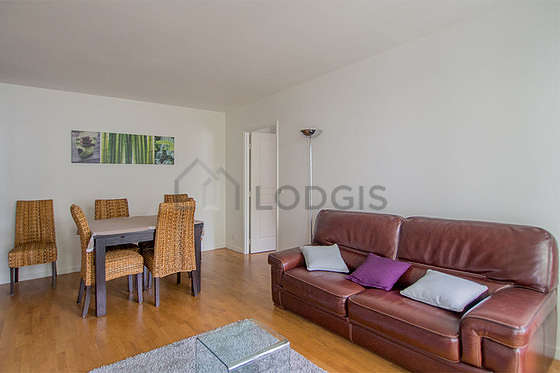 SalaõEste apartamento é composto de um bonito salão com parqué no piso vista sobre jardim. Este salão very quiet mobiliado et equipado para uma agradável estância : sofá, mesa de jantar, mesinha, 6 cadeira(s), entry way table, floor lamp, lamp, pouffe.