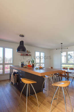Este apartamento tem uma magnífico cozinha com parqué no piso e todo o equipamento pela sua vida quotidiana : fogaõ, frigorífico, congelador, forno, torradeira, chaleira, máquina de café, armário, loiça, electrodomésticos, banco, bar.