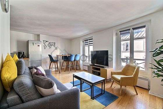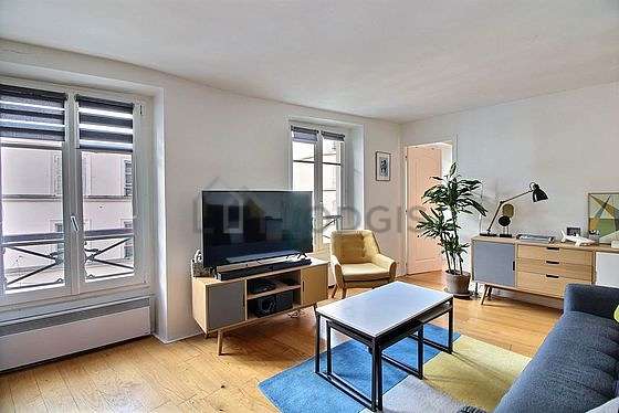 Este apartamento é composto de um charmoso salão com parqué no piso vista sobre rua. Este salão calmo mobiliado et equipado para uma agradável estância : televisaõ, mesinha, prateleira, tv stand1 sofá-cama.