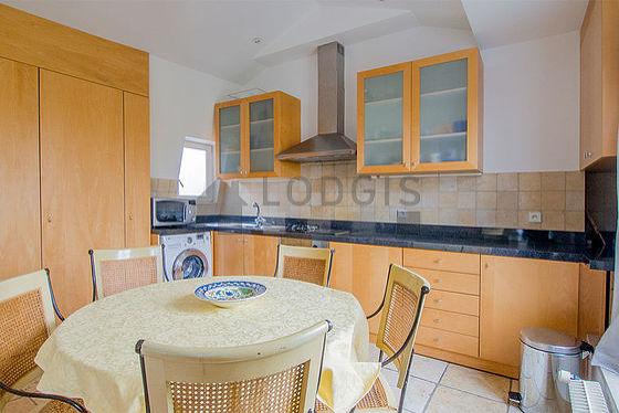 Este apartamento tem uma bonita cozinha com azuleijo no piso e todo o equipamento pela sua vida quotidiana : fogaõ, frigorífico, forno, microondas, exaustur, mesa de jantar, prateleira, armário, loiça, 5 cadeira(s).