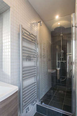 Este apartamento é equipado de uma casa de banho agradável é clara. Esta sala de água dispõe do necessário pelo seu bem estar na sua vida quotidiana : toalhas de banho, armário, ducheiro separado, sink, radiator secador de toalhas. Os WC são separados da casa de banho e situados em uma peça independente.