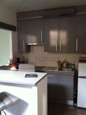 Este apartamento tem uma bonita cozinha com azuleijo no piso e todo o equipamento pela sua vida quotidiana : fogaõ, frigorífico, congelador, forno, exaustur, máquina de café, armário, loiça, 4 cadeira(s), bar.