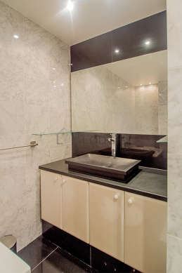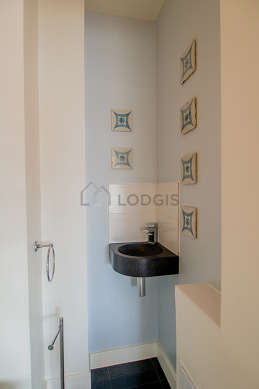 Este apartamento é equipado de uma casa de banho magnífico é muito clara. Esta sala de água dispõe do necessário pelo seu bem estar na sua vida quotidiana : armário, banheira, ducheiro separado, sink, ventilator. Os WC são separados da casa de banho e situados em uma peça independente.