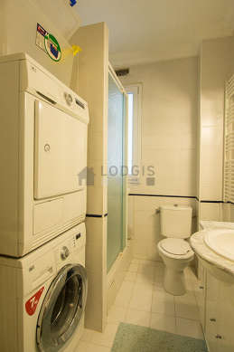 Este apartamento é equipado de uma casa de banho agradável. Esta sala de água dispõe do necessário pelo seu bem estar na sua vida quotidiana : toalhas de banho, armário, ducheiro separado, secador, sink, radiator secador de toalhas. Os WC são integrados na casa de banho.