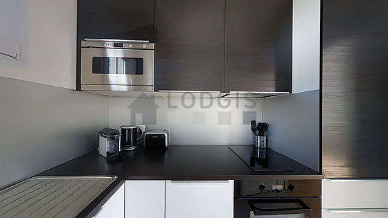 Este apartamento tem uma cozinha com azuleijo no piso e todo o equipamento pela sua vida quotidiana : fogaõ, frigorífico, congelador, forno, microondas, exaustur, torradeira, chaleira, máquina de café, prateleira, armário, loiça.