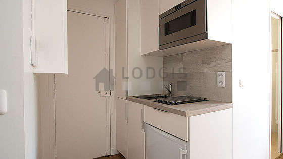 Este apartamento tem uma bonita cozinha perto do salaõ com parqué no piso e todo o equipamento pela sua vida quotidiana : fogaõ, frigorífico, micro-ondas combinado, freezer, chaleira, prateleira, armário, loiça.