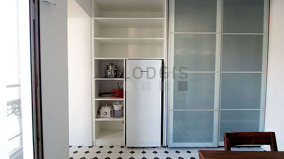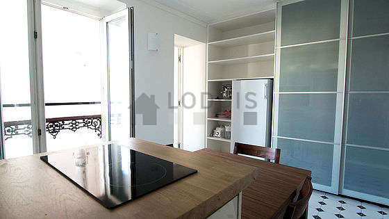 Este apartamento tem uma magnífico cozinha com azuleijo no piso e todo o equipamento pela sua vida quotidiana : fogaõ, frigorífico, congelador, forno, exaustur, máquina de café, mesa de jantar, prateleira, armário, loiça, 3 cadeira(s).