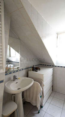Este apartamento é equipado de uma casa de banho agradável é clara with janelas vitros duplos. Esta sala de água dispõe do necessário pelo seu bem estar na sua vida quotidiana : toalhas de banho, prateleira, armário, ducheiro separado, sink, radiator secador de toalhas. Os WC são integrados na casa de banho.