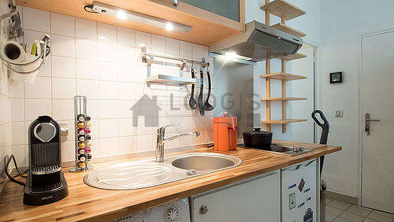 Este apartamento tem uma magnífico cozinha com azuleijo no piso e todo o equipamento pela sua vida quotidiana : fogaõ, frigorífico, micro-ondas combinado, freezer, exaustur, torradeira, chaleira, máquina de café, prateleira, armário, loiça.