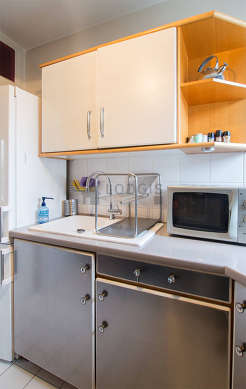 Este apartamento tem uma bonita cozinha com azuleijo no piso e todo o equipamento pela sua vida quotidiana : fogaõ, frigorífico, congelador, forno, microondas, torradeira, chaleira, máquina de café, mesinha, armário, loiça, 1 cadeira(s).