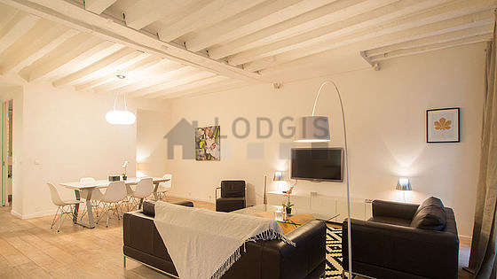 Este apartamento é composto de um soberbo salão com parqué no piso vista sobre rua. Este salão very quiet mobiliado et equipado para uma agradável estância : televisaõ, sofá, mesa de jantar, mesinha, viga, tv stand.