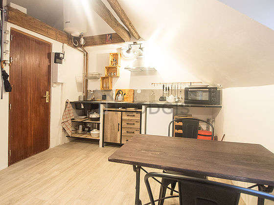 Este apartamento tem uma magnífico cozinha com parqué no piso e todo o equipamento pela sua vida quotidiana : fogaõ, frigorífico, forno, micro-ondas combinado, freezer, mesa de jantar, prateleira, 2 cadeira(s).