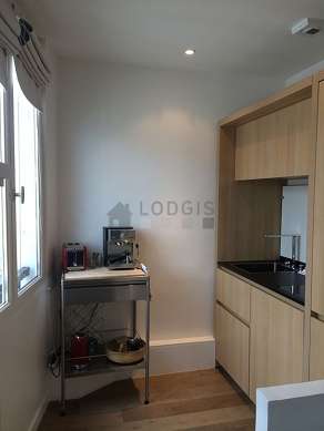 Este apartamento tem uma magnífico cozinha com parqué no piso e todo o equipamento pela sua vida quotidiana : fogaõ, frigorífico, congelador, microondas, torradeira, armário, loiça.