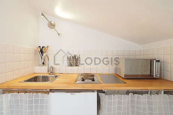 Este apartamento tem uma cozinha perto do salaõ com azuleijo no piso e todo o equipamento pela sua vida quotidiana : fogaõ, frigorífico, microondas, freezer, chaleira, loiça.